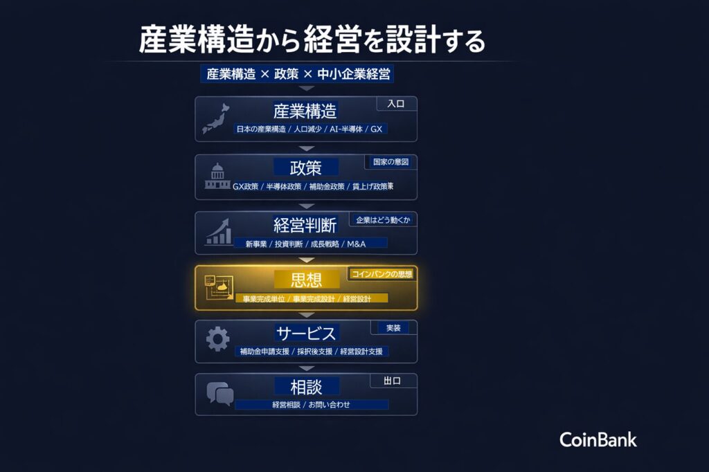 コインバンクは、産業構造・政策・中小企業経営を一つの流れで整理し、 経営判断の地図を提供します。