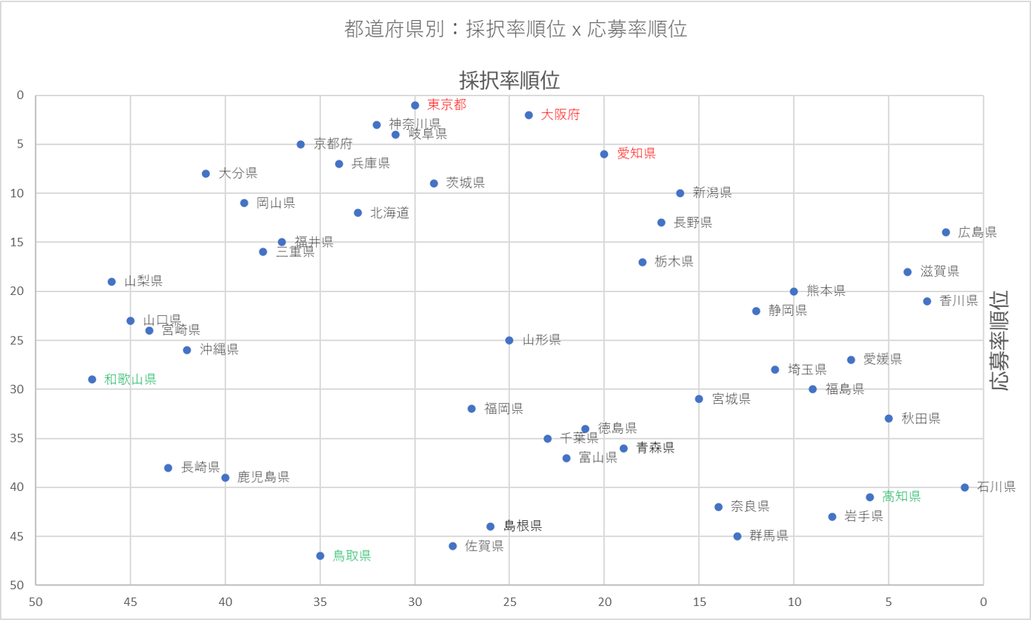以下に、都道府県別の採択率順位と応募率順位をプロットしたグラフを示します。