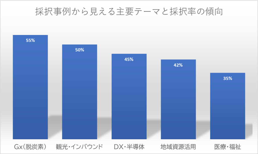まとめると、採択件数は大都市圏に集中する一方、地方では特色ある取り組みが高い採択率を実現しています。次回以降の申請においては、地域資源の活用や政策テーマ(GX・DX・観光振興)との親和性を意識した計画づくりが重要です。