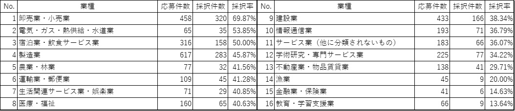 順位 業種 応募件数 採択件数 採択率 主な特徴