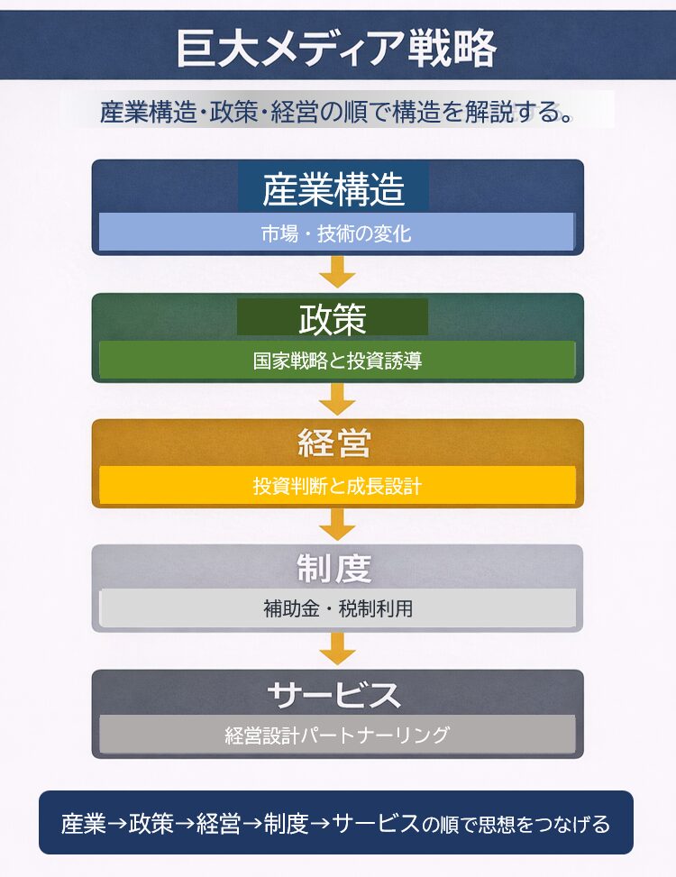 補助金とは、企業の経営戦略を加速する政策ツールである。 企業の意思決定は 「産業構造 → 国家政策 → 経営戦略 → 補助金」 の順序で決まる。