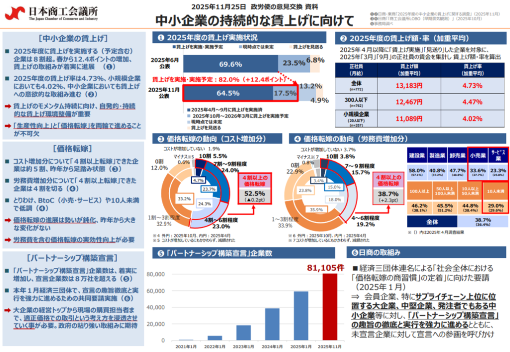 政府は「賃上げを事業者に丸投げせず、継続的に賃上げできる環境を整備する」という方針を示しています。 具体的には、価格転嫁・取引適正化の徹底、1兆円規模の中小企業・小規模事業者向け支援、 生産性向上のための設備投資・省力化投資の支援、重点支援地方交付金を通じた賃上げ環境整備などを 総合経済対策として打ち出し、5%台の賃上げモメンタムを定着させることを狙っています。